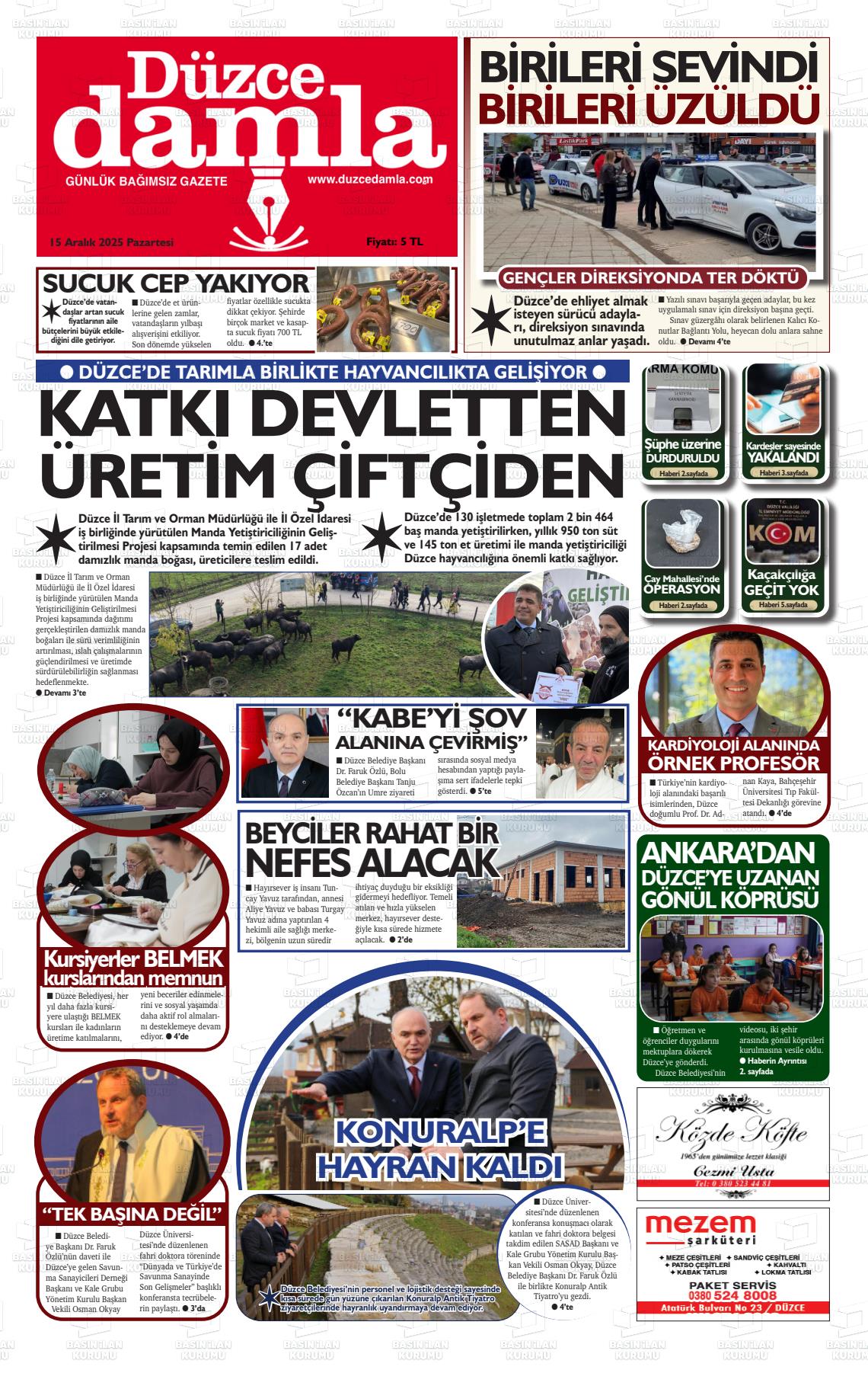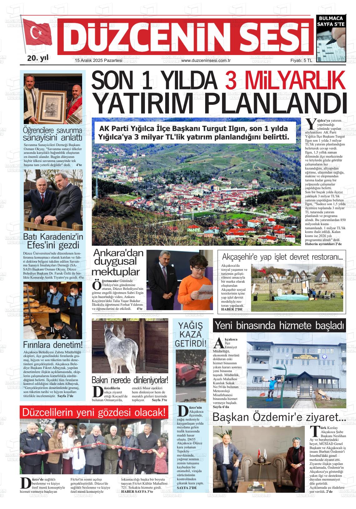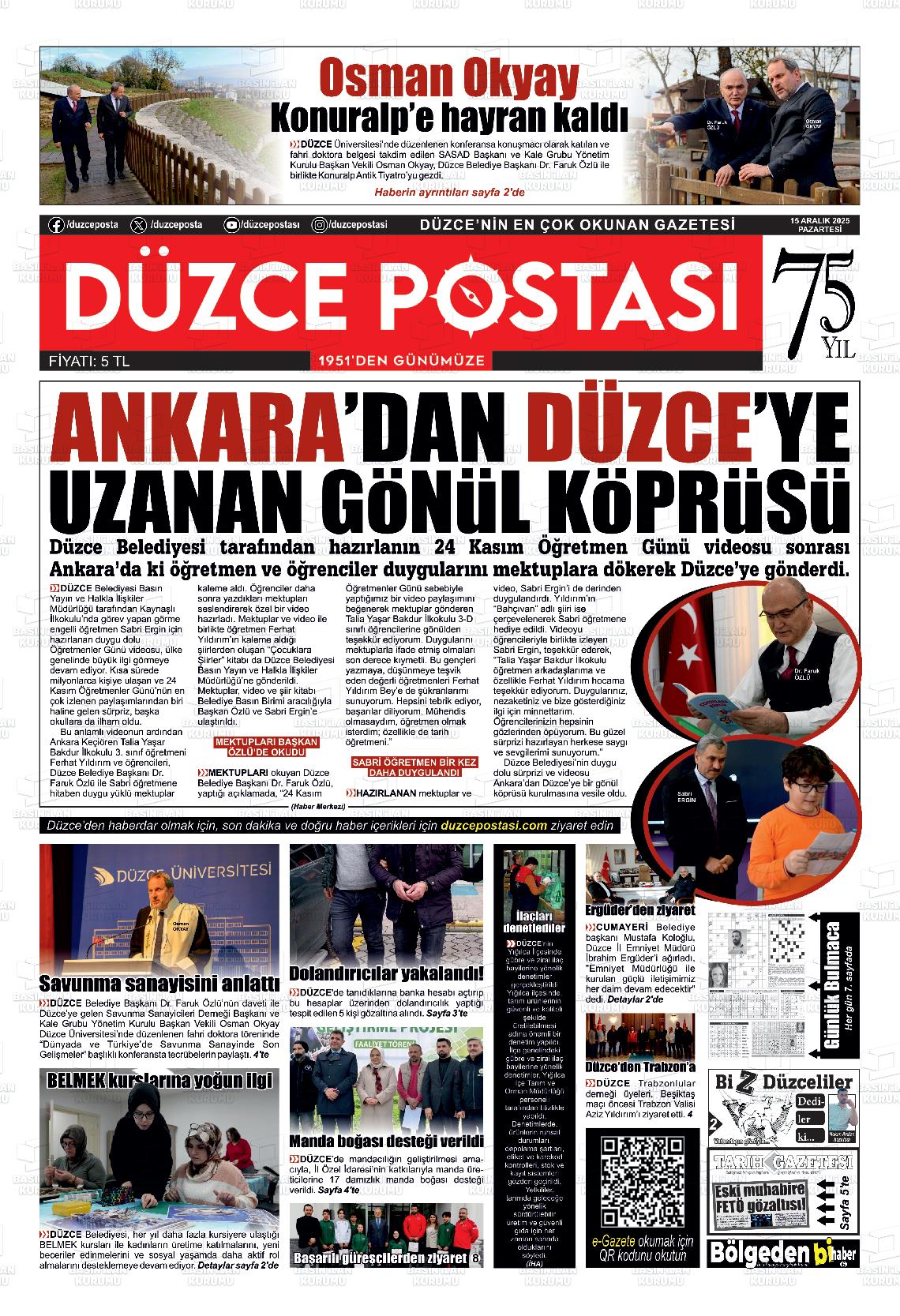 Düzce Yerel Gazeteleri 15 Aralık 2025, Pazartesi Günü Manşeti