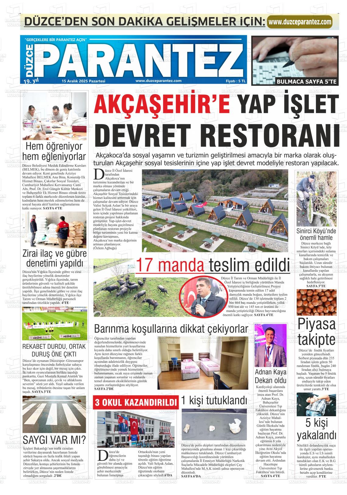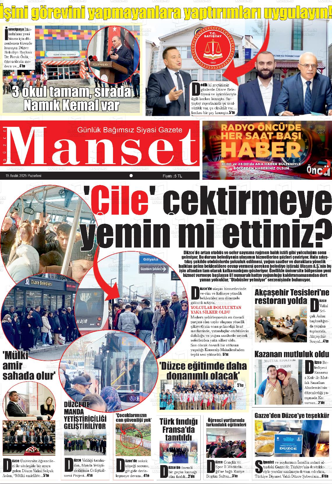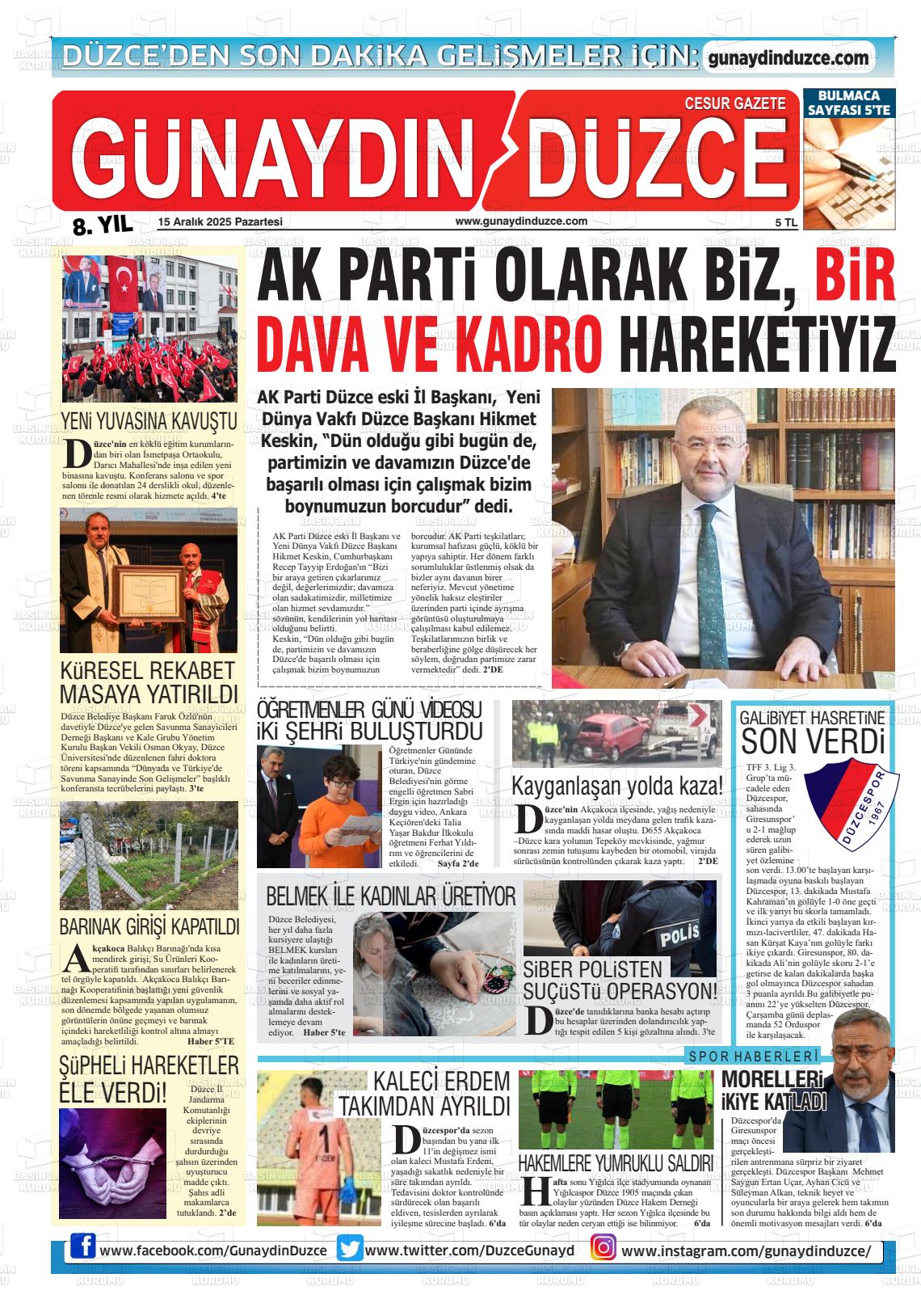 Düzce Yerel Gazeteleri 15 Aralık 2025, Pazartesi Günü Manşeti