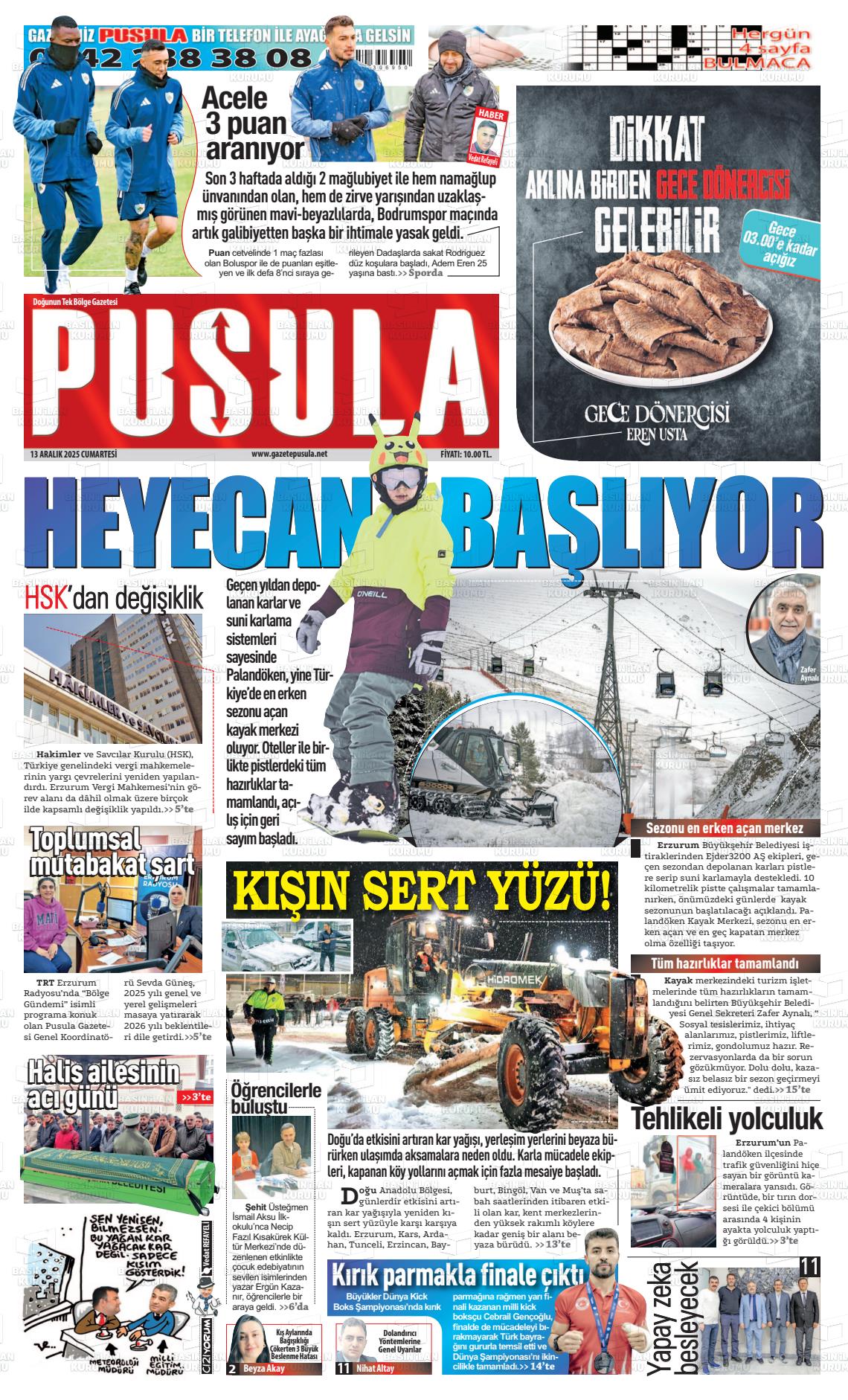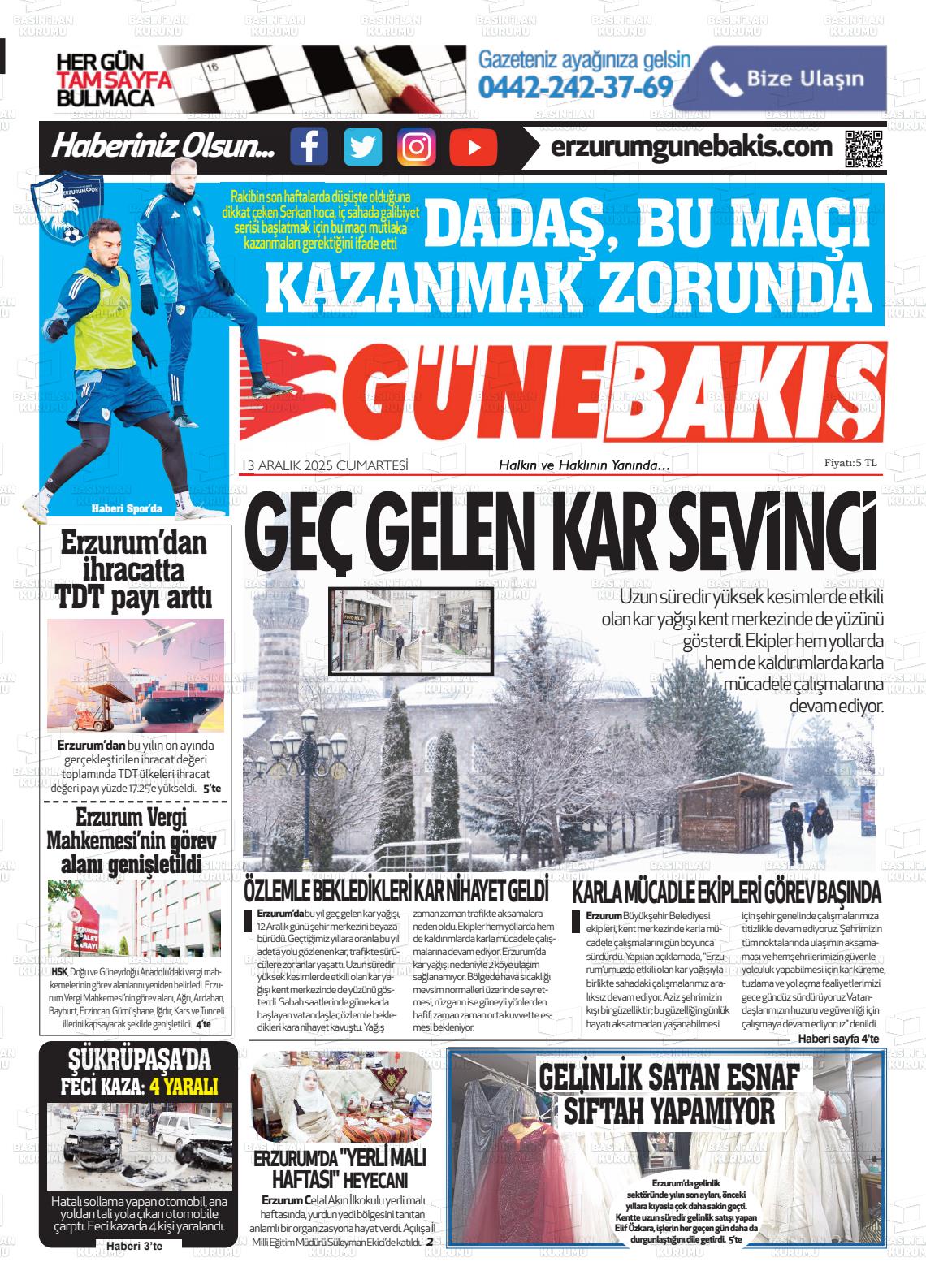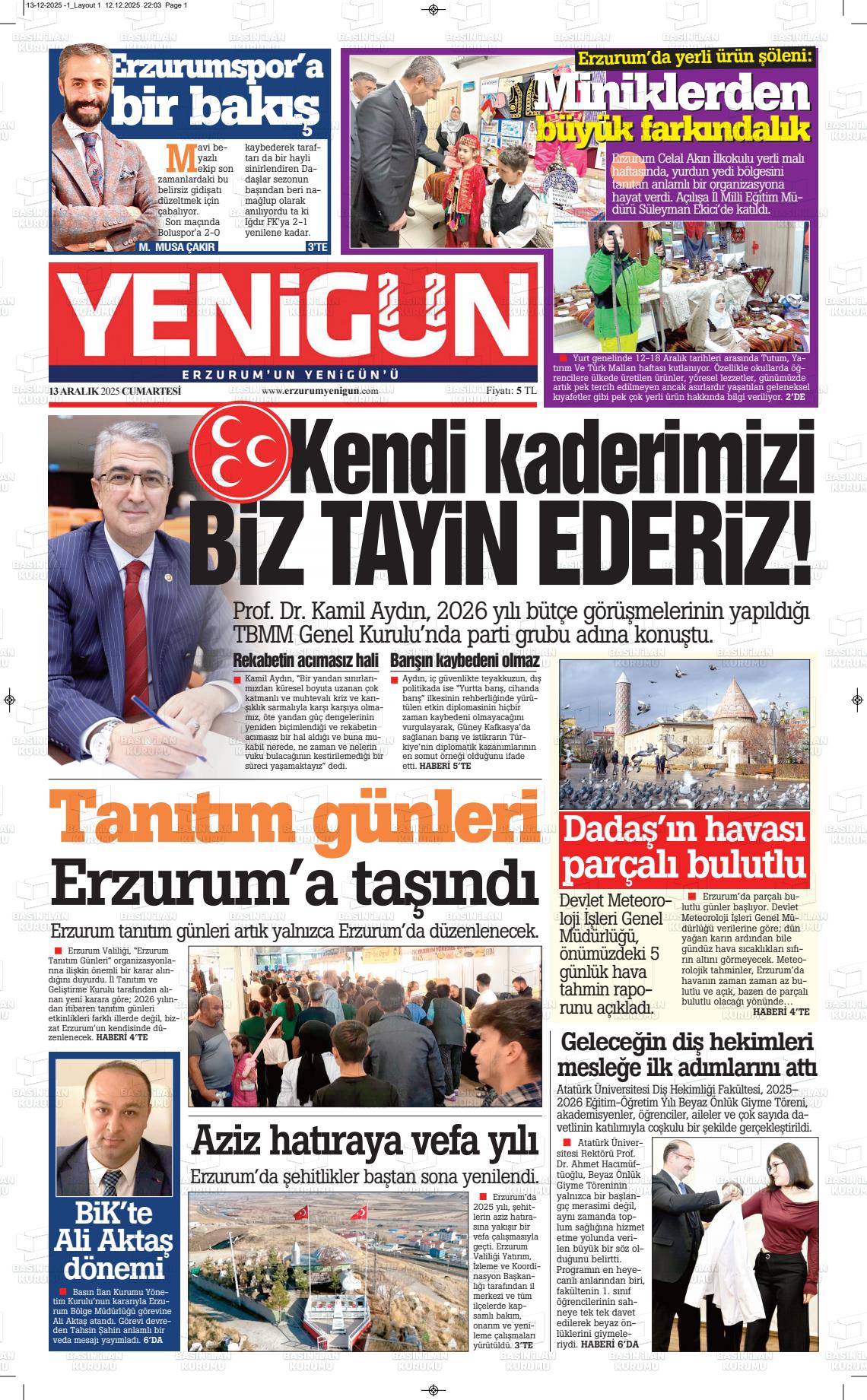 Erzurum Yerel Gazeteleri 13 Aralık 2025, Cumartesi Günü Manşeti